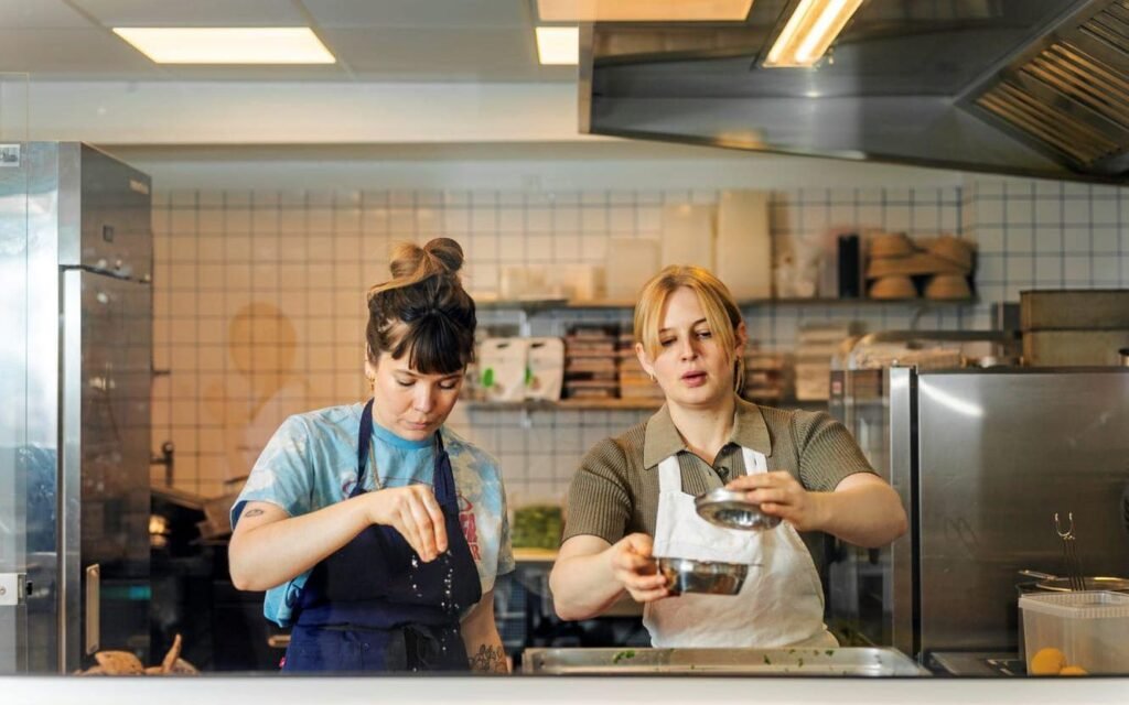 Sustainability runs through her methods as much as her menus. Oils pressed from leek tops, dressings blended from tired herbs, cooking water saved for soups. “Don’t be afraid of leftovers,” she told Tappin. “If something’s gone bad you can usually see it, smell it or taste it. If it tastes fine you can eat it” Hannah Tappin.