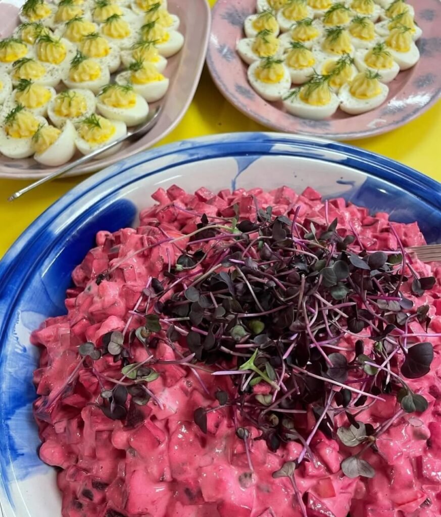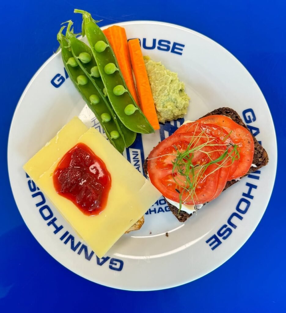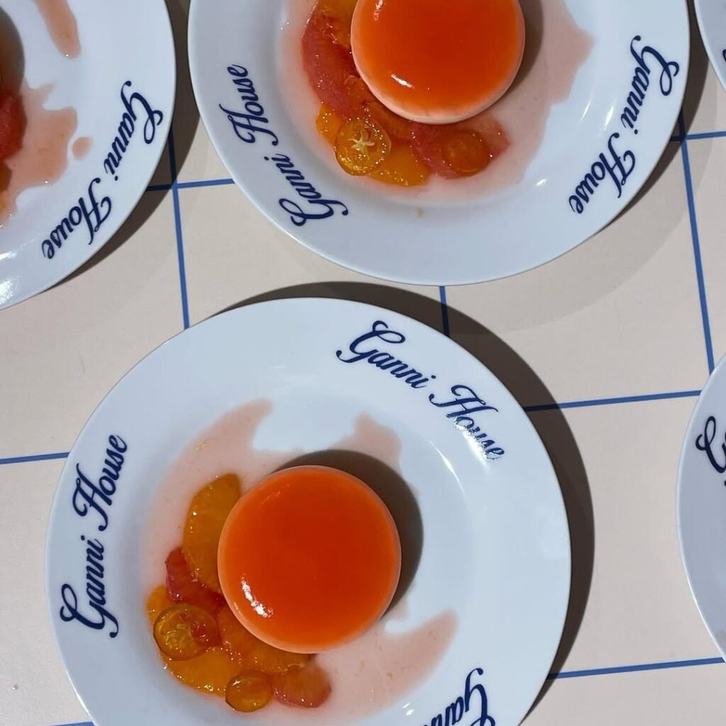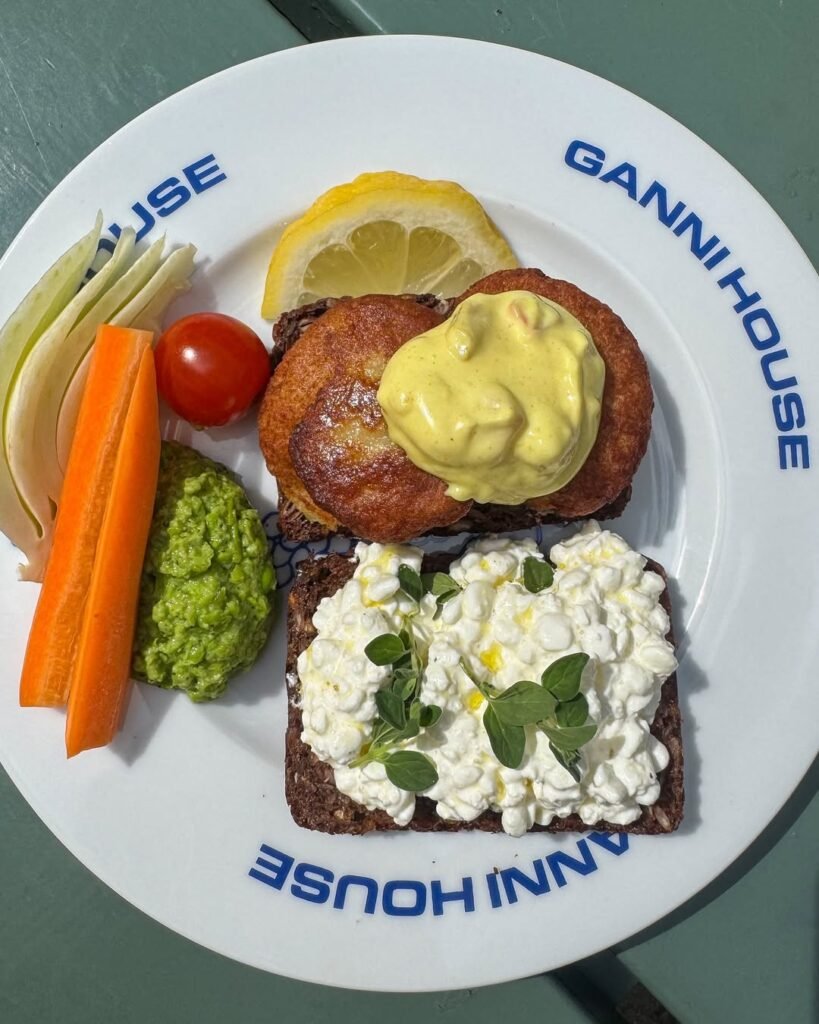 Her food carries the same democratic spirit as the brand. “The Ganni Girl eats colourful food that’s as sustainable as possible without it being boring,” she told writer Hannah Tappin in 2023. On any given week that might mean rye bread with potatoes, noodle salads, curries, or lentils. Seasonal Danish produce sets the rhythm — wild garlic in spring turned into pesto and oil, cucumbers and radishes folded into summer salads, corn charred on the grill in late August.