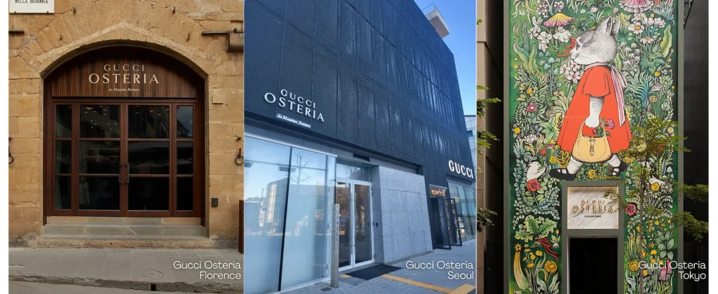 Gucci Osteria has redefined what a fashion-house restaurant can be. From Florence to Beverly Hills, Tokyo to Seoul, each location functions as a creative hub — more like a members’ club than a traditional flagship. Chefs Massimo Bottura and Karime López helm spaces that emphasize intimacy and creativity over exclusivity.